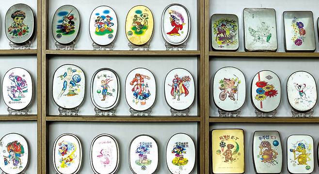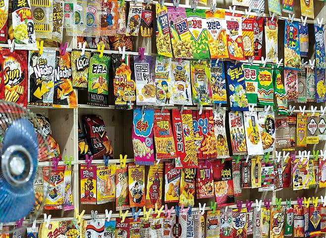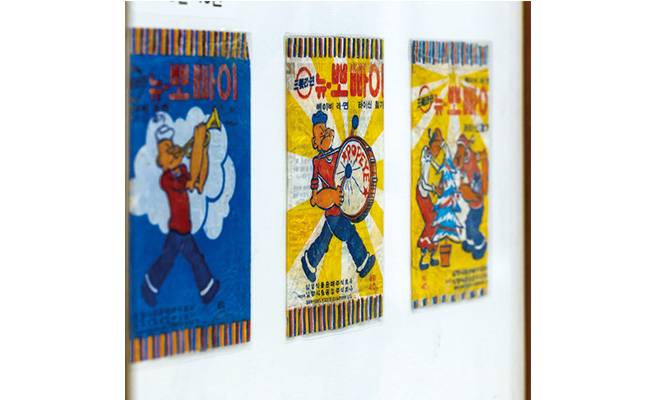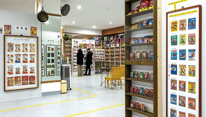 2023년 품귀 현상을 빚었던 ‘먹태깡’이 사실은 1985년 ‘명태맛깡’으로 이미 출시됐다는 것을 아는 사람은 많지 않을 것입니다. 이 씨는 “‘명태맛깡’이 1986년 유행한 만화 ‘쾌걸 조로’의 이름을 따 ‘노가리제트’가 됐다가 단종됐다”고 설명했습니다. 이밖에도 ‘타잔’, ‘호호아줌마’, ‘아톰’ 등 인기 있는 만화 주인공의 이름을 딴 과자봉지들이 벽에 걸려 그 당시의 시간을 소환하고 있습니다.