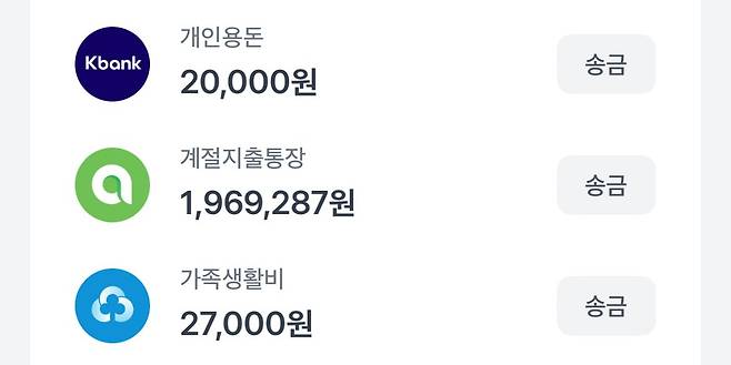 개인용돈과 생활비는 케이뱅크와 새마을금고 계좌에 넣고 체크카드로 사용합니다.