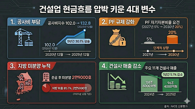 건설업 침체가 건설사 전반의 현금흐름과 수익성 부담으로 이어지고 있다. 공사비 부담이 이어지는 가운데 프로젝트파이낸싱(PF) 규제 강화, 지방 미분양 누적, 해외 사업 회수 불확실성도 함께 작용하고 있다. 신용평가 업계는 채권 회수와 유동성 대응력을 핵심 변수로 보기 시작했다.