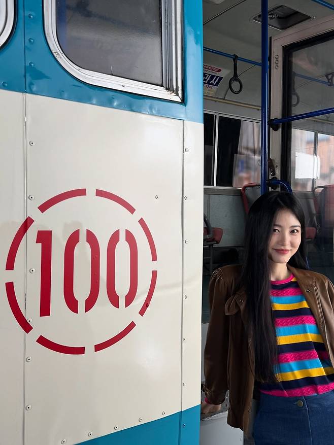 낡은 버스의 푸른색 차체와 붉은색 ‘100’ 숫자가 강렬한 레트로 무드를 전하는 장면 속에서 신예은이 선명한 컬러 플레이로 시선을 사로잡았다. 스트라이프 패턴의 니트 톱은 핑크, 옐로, 블루 등 원색 계열이 어우러져 생동감을 주었고, 가을을 닮은 브라운 레더 재킷과 매치되어 균형 잡힌 스타일링을 완성했다. 긴 생머리를 자연스럽게 내린 채 밝게 미소 지은 모습은 전체 룩에 청량한 무드를 더했다.