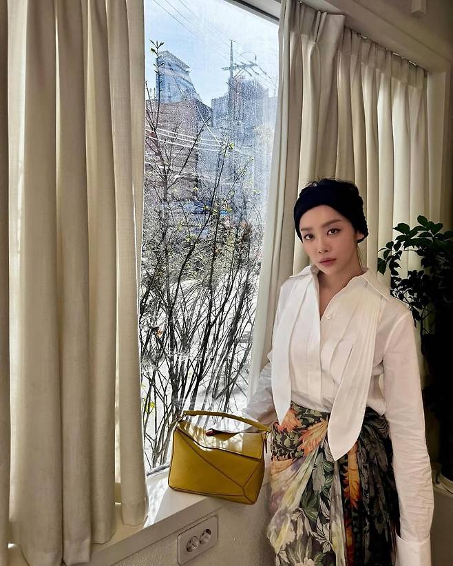 창가에서 포착된 차주영은 클래식한 화이트 셔츠에 화려한 플로럴 패턴의 스커트를 매치해 봄의 정취를 물씬 느끼게 하는 스타일을 연출하고 있다. 머스타드 컬러의 미니멀한 디자인의 핸드백이 포인트 아이템으로 활용되어 전체적인 룩에 생동감을 더하고 있다. 특히 머리에 착용한 블랙 터번은 세련된 분위기를 한층 더 높여주며, 창 너머로 보이는 도시 풍경과 어우러져 도시적인 감성을 표현하고 있다.