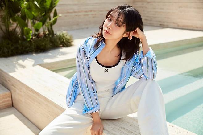 수영장 가에서 포착된 차주영은 화이트 탑에 블루 스트라이프 셔츠를 레이어드하여 경쾌하면서도 시크한 여름 스타일을 선보이고 있다. 화이트 와이드 팬츠와의 조합으로 쿨한 서머 룩을 완성했으며, 자연스럽게 흘러내리는 헤어스타일이 여유로운 분위기를 더해주고 있다. 밝은 햇살 아래 포착된 이 룩은 여름 휴양지에서의 편안함과 스타일리시함을 동시에 추구하는 그녀의 패션 감각을 엿볼 수 있게 한다.