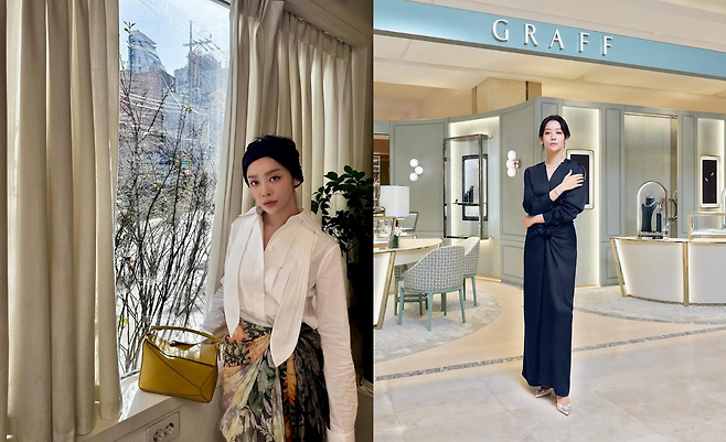 그라프 매장에서 포착된 차주영은 심플하면서도 고급스러운 올블랙 드레스로 우아함의 극치를 보여주고 있다. V넥 라인과 허리 부분의 드레이핑 디테일이 돋보이는 이 드레스는 미니멀한 디자인임에도 불구하고 그녀의 세련된 분위기를 완벽하게 살려주고 있다. 은은한 광택의 실버 슈즈와 섬세한 주얼리로 포인트를 주어 럭셔리한 분위기를 한층 더 강조하고 있다.