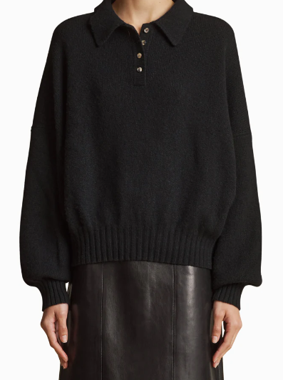 그녀가 착용한 니트는 디자이너 브랜드 케이트(KHAITE)의 제품으로, 볼륨감 있는 벌룬 소매와 짧은 기장이 특징인 폴로 스타일 스웨터다.