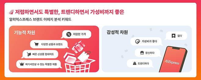 소비자들은 알리익스프레스를 떠올릴 때 ‘저렴한 가격’, ‘다양한 상품과 브랜드’, ‘빠른 신상품 업데이트’, ‘여기서만 살 수 있는 특별한 제품’ 등을 기능적 강점으로 꼽았다.