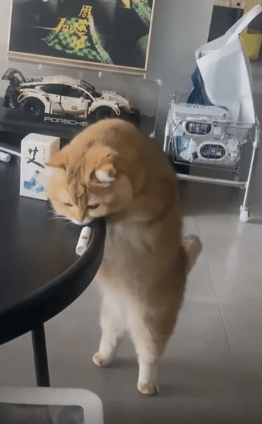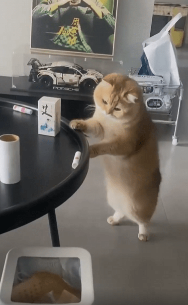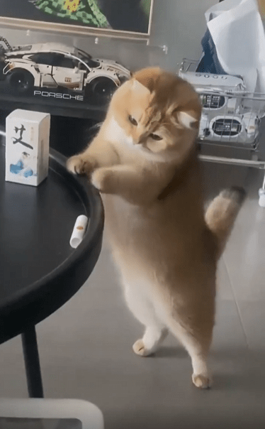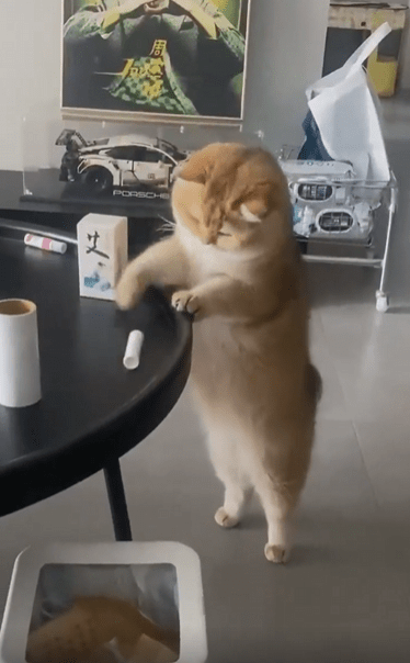 테이블 앞에 고양이 한 마리가 바짝 붙어 서 있습니다. 두 발로 일어선 채 앞발을 가지런히 테이블 위에 올려두고, 눈앞의 작은 물건 하나를 뚫어지게 바라보고 있죠. 이 고양이는 그걸 바닥으로 떨어뜨리고 싶어 합니다.