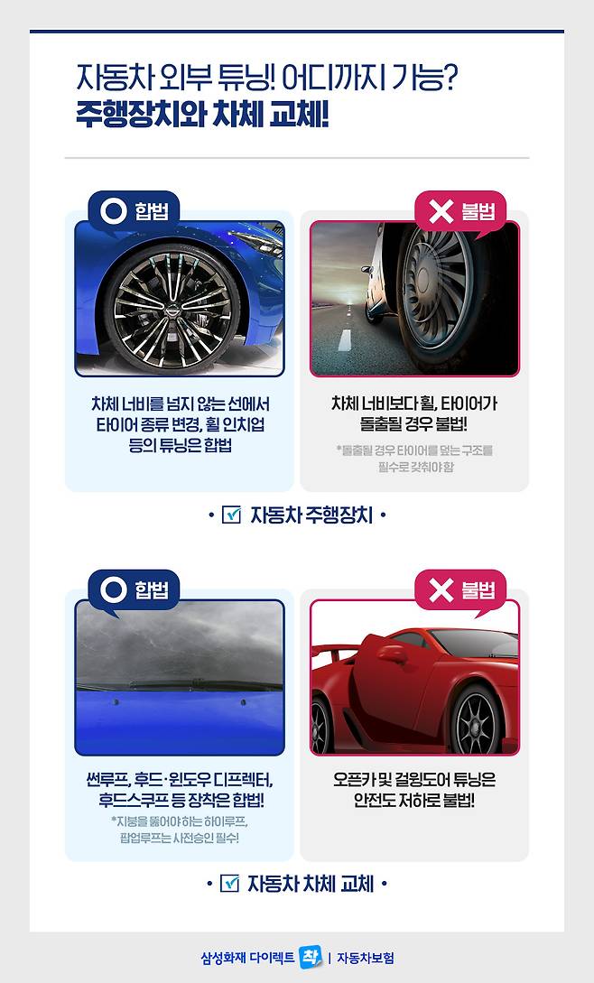 차체 너비를 넘지 않는 선에서 타이어 종류 변경, 휠 인치업 등의 튜닝을 할 경우 합법입니다. 단, 차체 너비보다 휠, 타이어가 돌출될 경우 불법입니다. 만약 돌출을 원한다면 그 위로 타이어가 덮어지는 구조를 필수로 갖추어야 합니다.