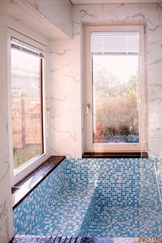 처음에는 2인용 욕조를 넣을까 했는데 그것보다는 수영장처럼 아예 타일을 붙여서 공사하는 게 여러모로 좋을 것 같다는 생각이 들더라고요. 양쪽으로 창을 내서 여름에는 문을 다 열면 야외에서 수영하는 느낌도 나고, 추운 겨울에는 눈 오는 밖을 보면서 따뜻하게 반신욕을 할 수 있게 설계를 했습니다.