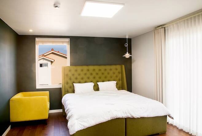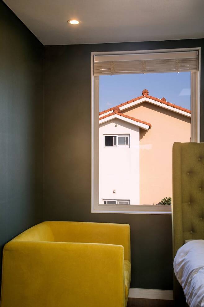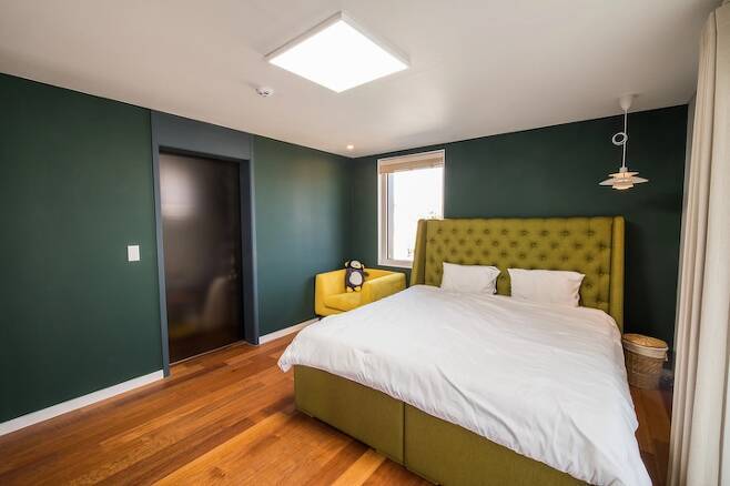 제가 육지에서 온 사람이라 부모님, 친구들이 다 육지에 살고 있어서 손님방이 꼭 필요했어요. 그동안은 부모님이 오시면 거실에서 주무시거나 호텔에서 주무시곤 했는데 설계할 때 방 하나는 꼭 빼서 손님방을 만들어야겠다고 생각했어요. 2층은 저희 부부, 아들이 쓰는 방이 있고 1층을 게스트룸으로 꾸며봤어요.