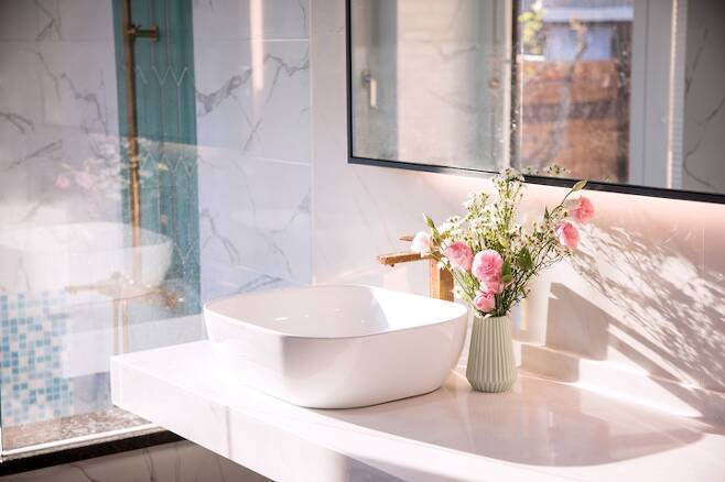 야외로 나갈 수 있게 창을 낸 것도 정말 잘한 것 같아요. 여름이면 밖으로도 편하게 오갈 수 있어서 야외풀장 같은 느낌도 확실히 들고요! 타일 고르기, 수전 고르기, 거울, 유리 모두 다 제가 다 고르고 골라서 작업한 건데 나중에는 타일을 너무 많이 봐서 정신이 혼미해지더라고요. ^^ 그래도 만족스러운 결과물이 나와서 저희 집에서 제가 특히 애정하는 공간입니다.