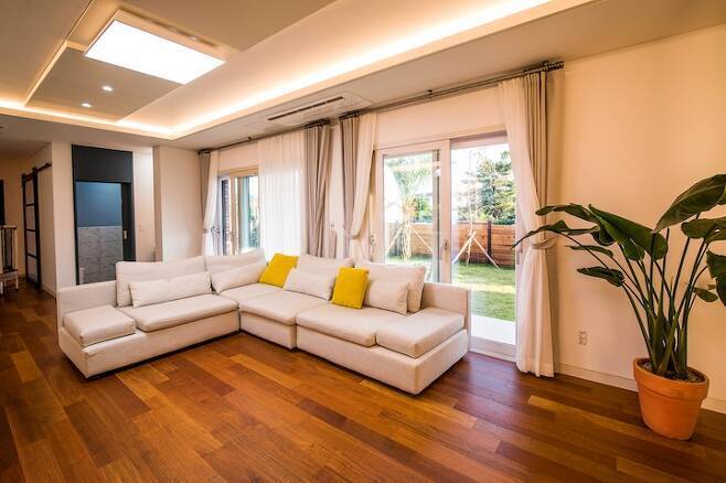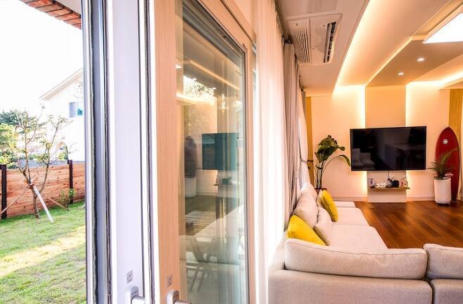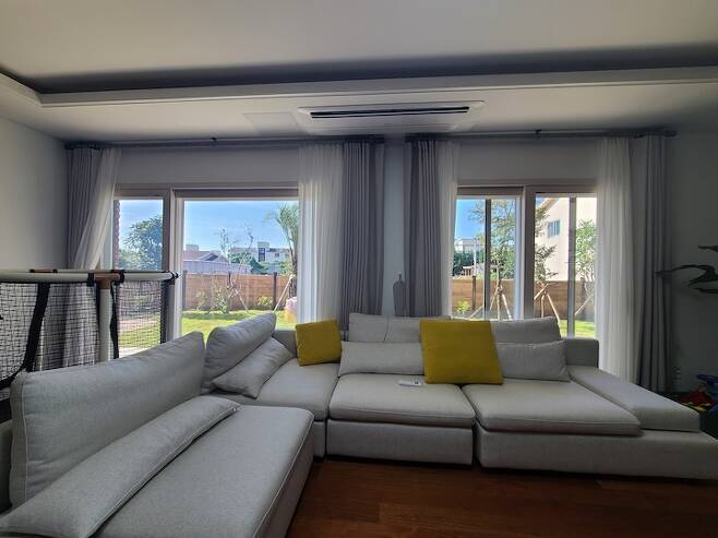 층고의 아쉬움은 우물천장으로 달랬지만 여전히 층고는 볼수록 아쉽네요. 거실에는 아주 큰 창문을 내서 마당으로 바로 나갈 수 있게 설계하였고요, 바람이 많이 부는 제주도 특성상 창호에는 아낌없이 투자했어요. 이건창호의 이중창으로 모두 설치했는데 정말 대 만족입니다. 전원주택은 춥다는 편견을 아예 없애주었고, 바람도 많이 불고 태풍도 자주 오는 제주에서 창문만 꼭 닫으면 바람 소리, 빗소리, 심지어 외부에서 들리는 모든 소리를 차단해 주고 외부에서 바람이 새어들어오지 않아 정말 따뜻한 겨울을 보내고 있습니다.