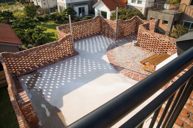여기는 2층테라스 공간이에요. 아주 넓고, 옆집과의 프라이버시를 위해 벽돌로 난간 작업을 했어요. 2층에서 고기도 구워 먹고 풍경도 감상할 생각으로 만들었어요.