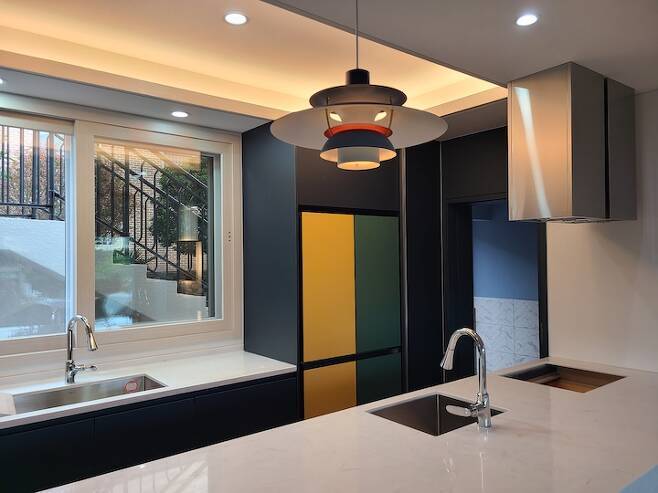 주방의 상부장을 포기하고 넓은 창문으로 대신했어요. 수납보다는 뷰를 선택했다고나 할까요. ^^ 사실 뷰라고 해봤자 이층 외부 계단이긴 하지만 상부장보다는 넓은 창문을 하고 싶었어요.