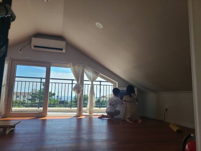여기는 2층 아이 방입니다. 아이 방이 뷰가 가장 좋아요. 책상에 앉으면 산방산이 바로 딱 보이도록 창문을 냈어요.