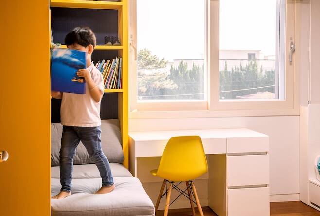아이 방에는 코너 책장을 꼭 짜주고 싶어서 공사 처음 시작할 때부터 말씀드렸던 부분이었어요. 코너 책장 밑으로 아이가 앉아서 책을 읽을 수 있는 공간을 만들어주었어요. 앉거나 누워서 책을 편하게 읽을 수 있는 공간이 저희 아이방에서 가장 마음에 듭니다.