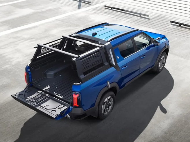 디자인은 각진 박스형 실루엣을 기반으로 하면서도, 전면 LED 헤드램프와 전기차 특유의 깔끔한 디테일을 조화롭게 담아냈다. 후면 데크는 최대 500kg 적재 가능해 자전거, 캠핑 장비, 서핑보드, 낚시 도구 등 다양한 아웃도어 기어를 넉넉하게 실을 수 있다. 차박과 레저의 베이스캠프 역할을 톡톡히 해내는 다목적 트럭이다.