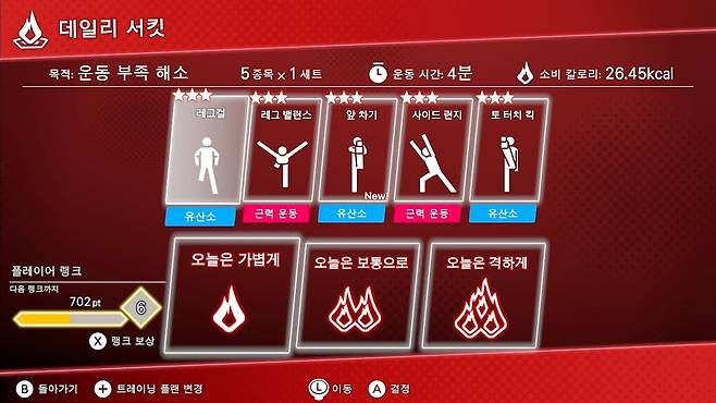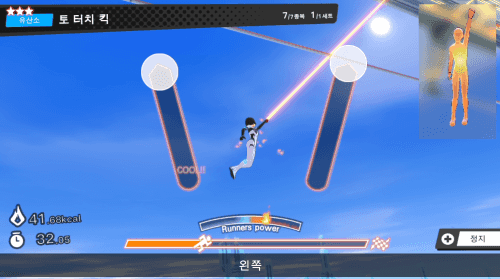 게임을 시작할 때 하는 워밍업 스트레칭, 게임을 끝낼 때 하는 쿨다운 스트레칭 동작도 꽤 난이도가 높습니다. 한쪽 다리로 균형을 잡거나 하체를 낮추는 동작이 많은데, 바쁠 때는 스트레칭만 하고 꺼도 충분히 운동이 되는 느낌이었습니다.
