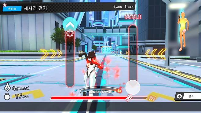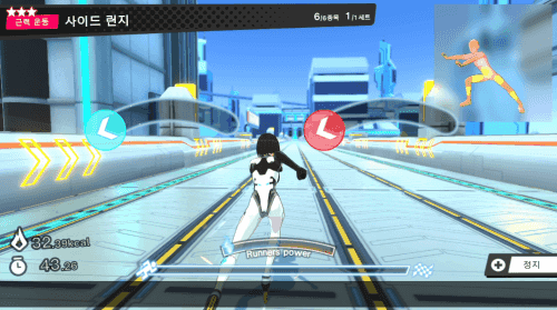 '피트니스 러너'는 유산소 운동과 근력 트레이닝을 교대로 실시해 단시간에 효율적으로 지방 연소, 근력 강화, 근지구력 향상을 목표로 하는 '슈퍼 서킷 트레이닝'을 표방합니다. 매일 플레이할 것을 요구하는 대부분의 운동게임과 달리, 1일 10분, 주 3회 플레이만으로 운동 효과를 누릴 수 있다는 것을 전면에 내세우고 있지요. 이 역시 운동 시간을 내기 힘든 현대인의 일상에 활력을 불어넣고자 하는 EXFIT의 이념에 부합하는 것이라 볼 수 있습니다.