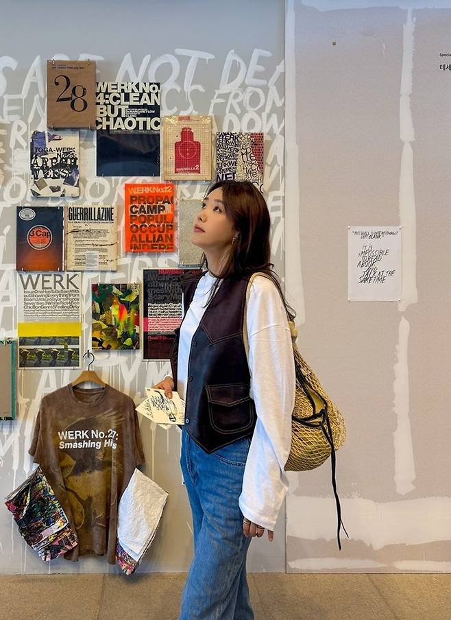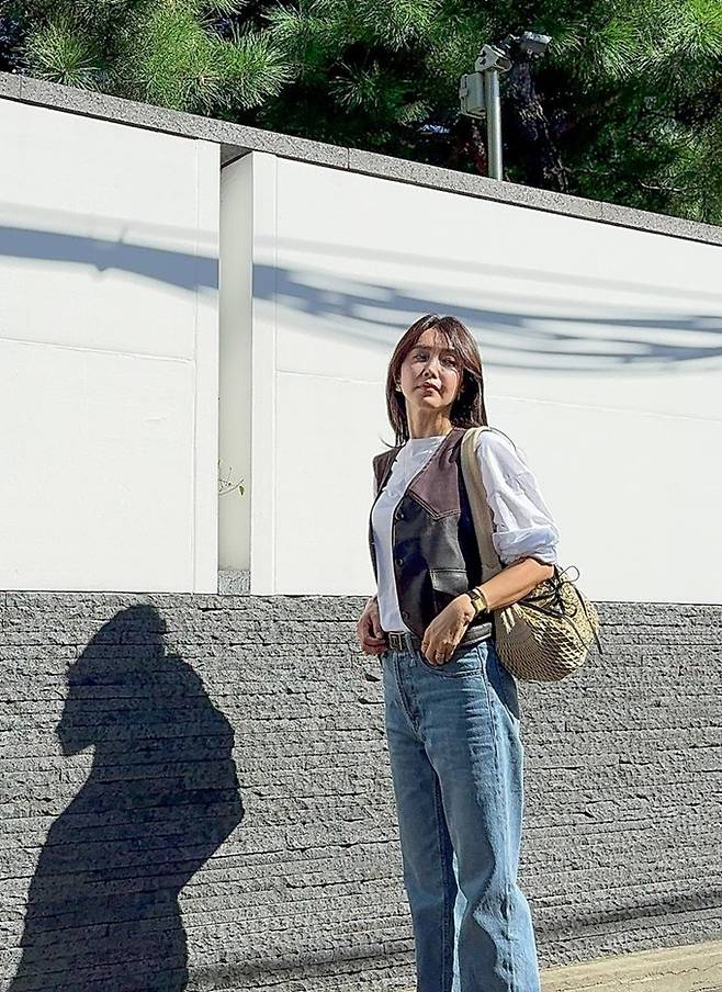 공개한 사진에서 채정안은 데님 팬츠와 화이트 티셔츠에 가죽 조끼를 착용한 레이어드 스타일로 심플하면서도 스타일리시한 나들이룩을 선보였다.