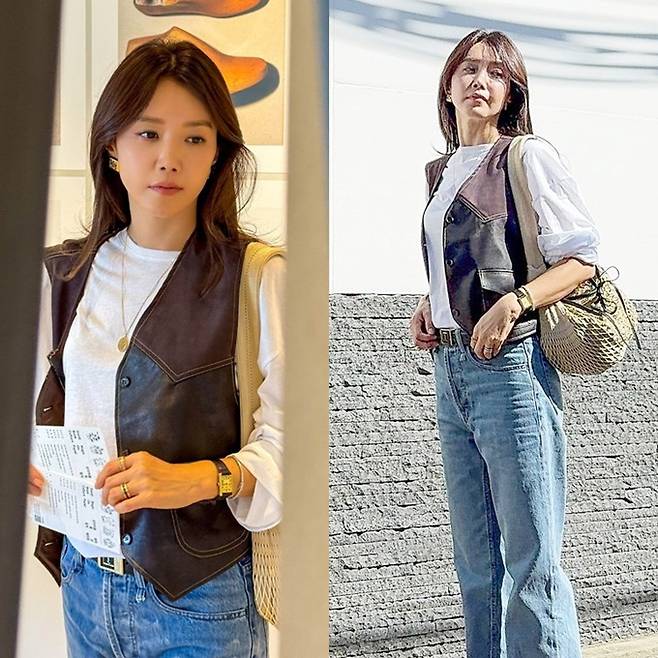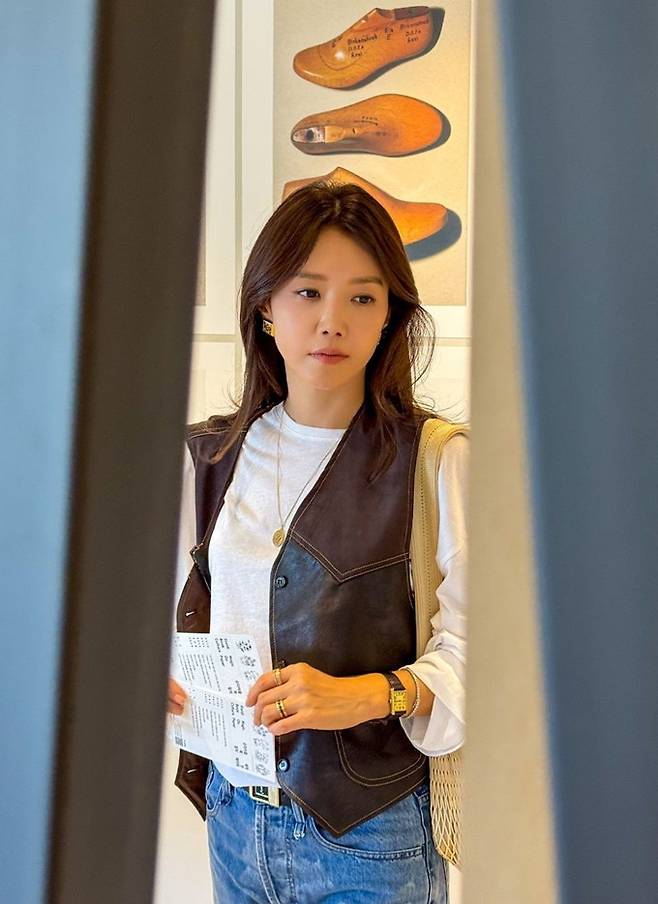 배우 채정안이 툭 걸친 가죽 조끼로 심플하면서도 스타일리시한 가을 나들이룩을 완성했다.