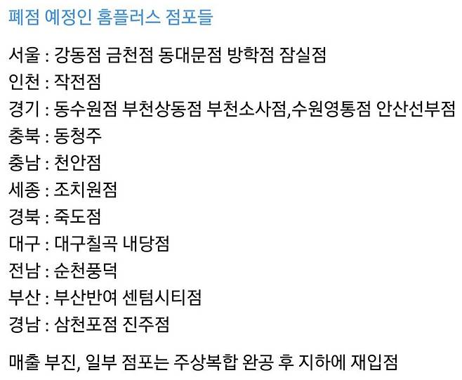 홈플러스는 회생절차와 별개로 매출 부진을 이유로 일부 점포를 정리하는 것으로 알려졌다. 온라인 커뮤니티를 중심으로 '폐점 예정인 홈플러스 점포들'이라는 글이 확산되고 있다.