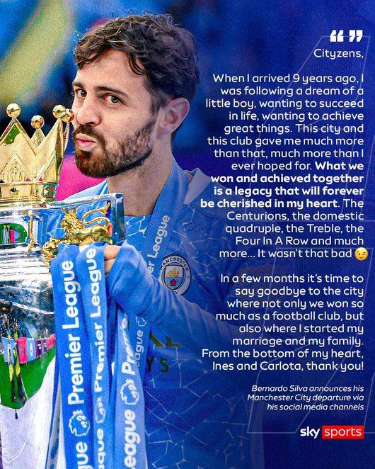 맨시티는 16일(한국시간) 구단 홈페이지를 통해 "실바는 시즌 종료 후 맨시티를 떠날 예정이다. 포르투갈 출신 플레이메이커인 그는 2017년 팀에 합류한 이후 9년 동안 총 451경기에 출전하며 구단의 황금기를 함께했다"라고 공식 발표했다.