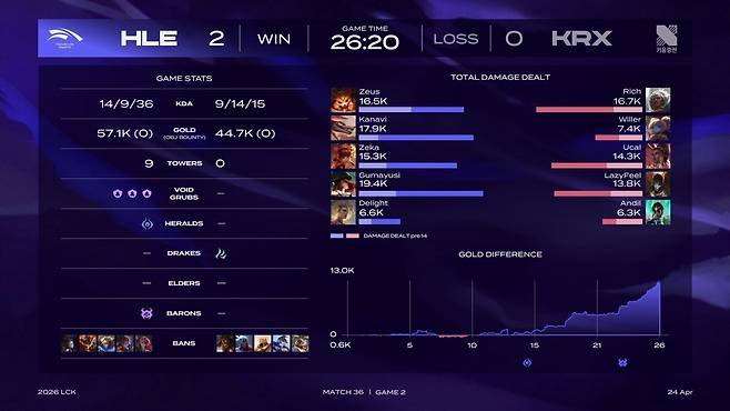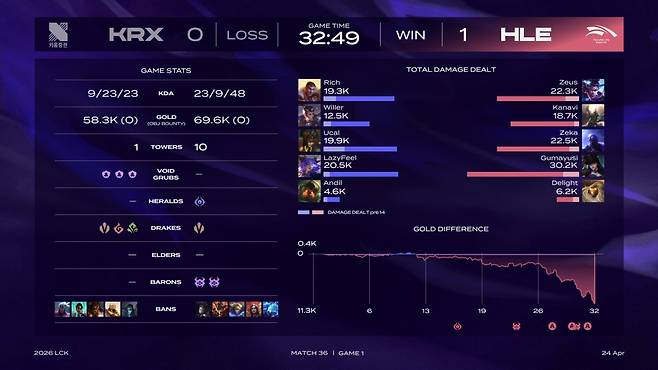 20분에 글로벌 골드는 5,000 이상 벌어졌다. 나피리가 잘리는 장면은 여전했지만, 이미 힘의 차이가 컸다. 드래곤 앞에서 '딜라이트'의 렐이 화끈하게 한타를 열었고, 그 위로 아군의 광역 대미지가 쏟아지면서 한화생명e스포츠가 대승을 거뒀다. 전리품은 바론이었다. '리치' 암베사의 상륙 작전도 손쉽게 무마시킨 한화생명e스포츠는 그대로 밀고 들어가 넥서스를 터트렸다.