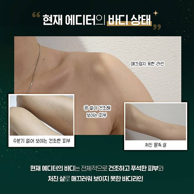 본래 에디터의 바디 피부는 각질과 건조함이 그대로 드러나 바디 피부 결이 거칠고 윤기가 부족해 전체적으로 푸석한 인상이 강했다. 특히 팔과 다리 라인은 울퉁불퉁해 보이고, 피부가 탁해 보이는 상태였다.