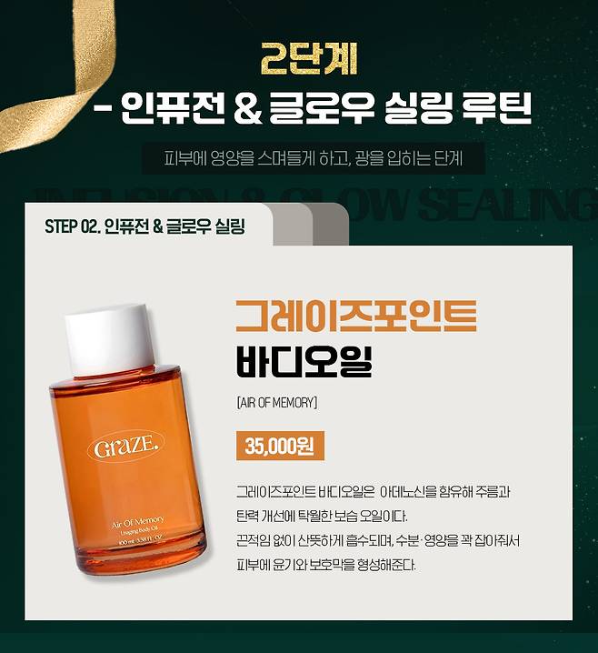 연말시상식처럼 광채와 윤기, 그리고 속보습까지 꽉 찬 보습감의 비결은 바디오일에 있다. 물론 바디스크럽과 바디로션도 필수다. 특히 오늘 소개한 그레이즈포인트 바디 오일은 국내 유일 식약처 고시 주름 개선 성분인 아데노신이 함유되어 있으며, 프리미엄 식물성 바디오일로 바디피부의 항산화와 장벽 개선에 탁월한 기능을 더했다.