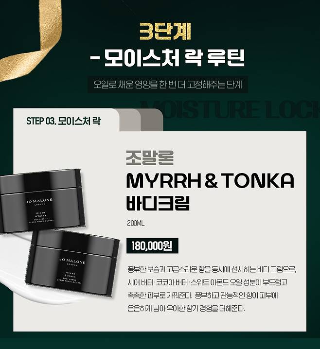 겨울철 연말시상식과 같은 매끈한 바디피부를 하루 종일 유지하고 싶다면, 바디로션보다 좀 더 묵직한 조말론 MYRRH & TONKA 바디크림을 사용해 보자, 앞단계의 바디스크럽 케어 덕분에 바디크림의 깊은 보습감을 완벽히 흡수해 줄 테니까. 특히 바디오일과도 궁합이 좋아서, 섞어서 사용하기 용이하다.