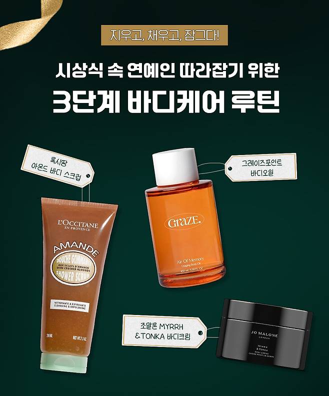연말 시상식처럼 특별한 순간을 앞두고 있다면, 바디 케어 역시 한 단계 더 신경 써야 할 타이밍이다. 바디스크럽으로 피부결을 정돈하고, 바디로션으로 촘촘히 채운 뒤 바디오일 한 방울로 윤광을 더하면, 조명 아래에서도 흔들림 없는 매끄러운 바디라인을 완성할 수 있다. 옷만큼 중요한 바디 피부, 올해 연말에는 디테일한 관리로 존재감을 완성해 보자.