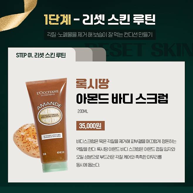 록시땅 아몬드 바디 스크럽은 부드러운 아몬드 껍질 입자가 피부 결 사이사이 노폐물을 깨끗하게 씻어내며 각질을 정돈해 준다. 각질 제거 후에도 당김 없이 촉촉함이 남아 다음 단계인 바디오일과 바디로션의 흡수력을 높여주며, 한층 깔끔한 바디 결로 정리해 주는 지우기 단계의 핵심 제품이다.