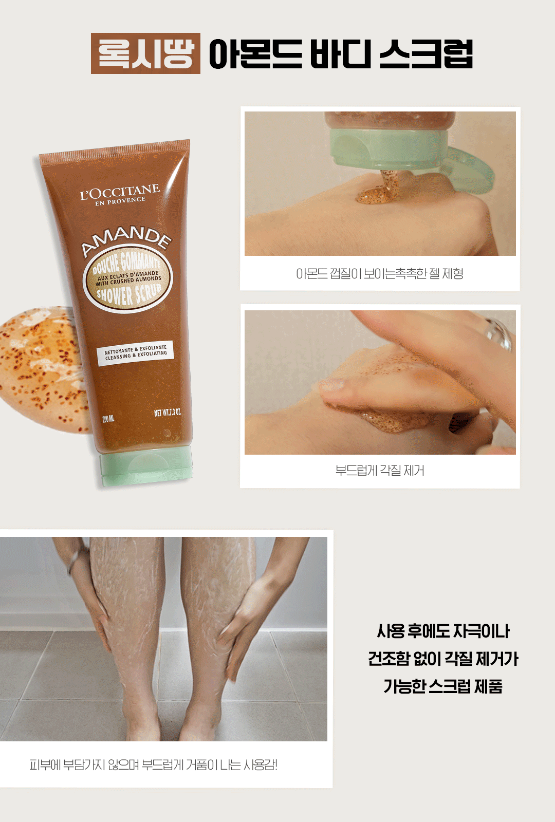 록시땅 아몬드 바디 스크럽은 젤처럼 부드러운 베이스에 아몬드 껍질 입자가 고르게 섞인 제형으로, 피부에 닿았을 때 자극 없이 편안하게 밀착되는 것이 특징이다. 문지르는 과정에서 입자가 자연스럽게 롤링되며 묵은 각질과 노폐물을 정돈해주고, 과하게 거칠지 않아 데일리 케어로도 부담이 적다.