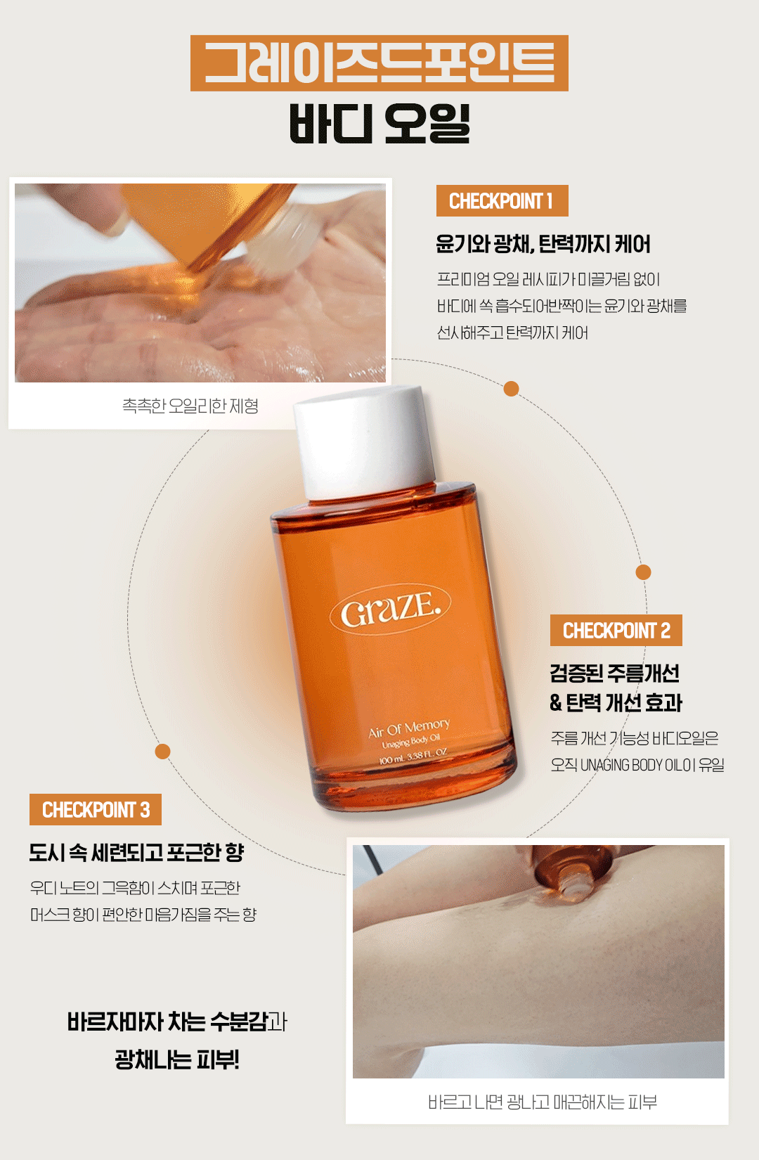그레이즈포인트의 바디오일은 피부에 닿는 순간 가볍게 퍼지며 끈적임 없이 빠르게 흡수되는 사용감을 보여준다. 항산화와 장벽 강화에 효과적인 식물성 오일이 피부 깊은 곳까지 인퓨전(infusion)되어 속보습을 확실하게 잡아주며, 피부 표면은 잔여감 없는 반짝이는 윤기와 자연스러운 광채를 남겨준다.