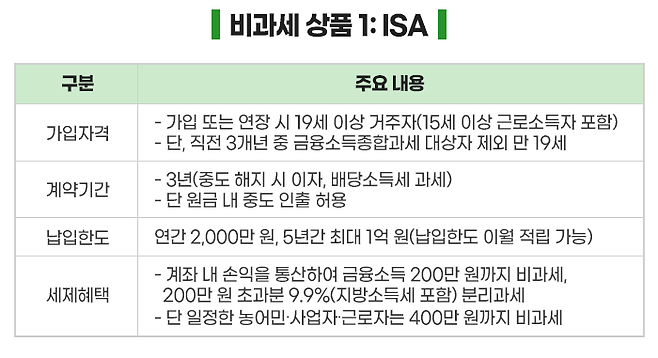 대표적인 비과세 상품인 ISA의 운용수익에 대해 200만 원(서민형∙농어민형은 400만 원)까지 비과세가 적용되고, 비과세 한도를 초과한 금액은 9.9%(지방소득세 포함) 분리과세를 합니다.
