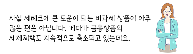 또 개인 투자자인 경우 저축과 투자금액의 규모도 한계가 있으니, 모든 절세 상품을 다 가입할 수도 없는 노릇이지요.