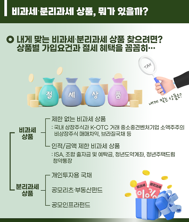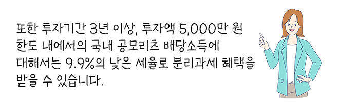 또한 일반적인 이자 및 배당소득세(15.4%)보다 낮은 세율로 세금이 부과되는 상품도 있기 때문에, 세금도 아끼고 종합과세에도 대비하시려면 반드시 분리과세 상품들을 아셔야 합니다.