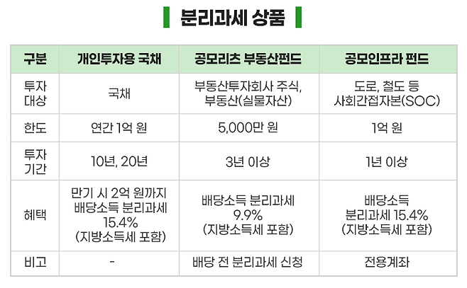 분리과세 상품으로는 개인투자용 국채, 공모리츠, 부동산펀드, 공모인프라펀드 등이 있습니다.