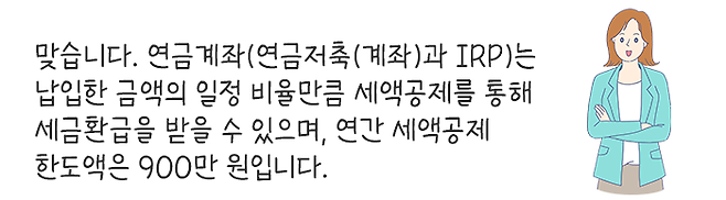 단, 연금저축에만 가입한 경우에는 저축 금액 중 한 해 600만 원까지 세액공제가 가능합니다. (IRP 단독으로는 900만 원까지 가능)