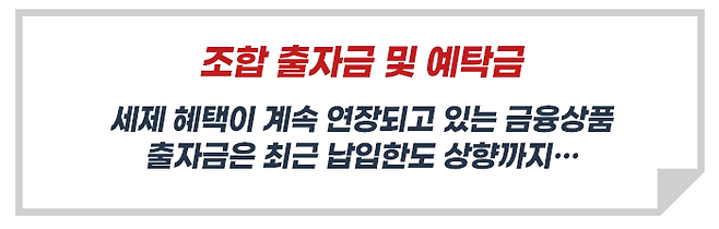 하지만 이런 와중에도 비과세 혜택이 계속 연장되고 있는 상품이 있는데, 바로 조합 출자금 및 예탁금입니다.