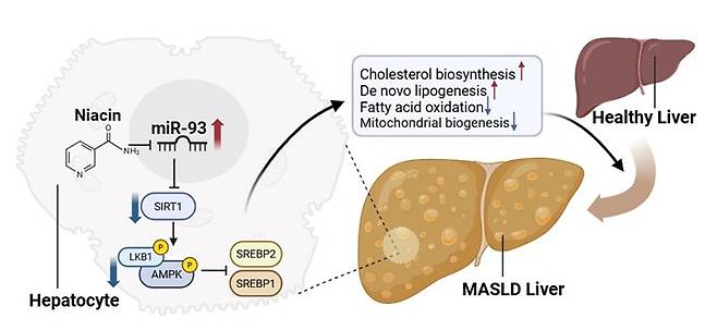 즉, 대사이상 지방간질환을 일으키고 발생시키는 원인은 miR-93이라는 유전물질이며, 이를 억제함으로써 간 기능을 개선할 수 있다. miR-93을 가장 효과적으로 억제하는 물질은 ‘비타민 B3(니아신)’로 알려졌다.