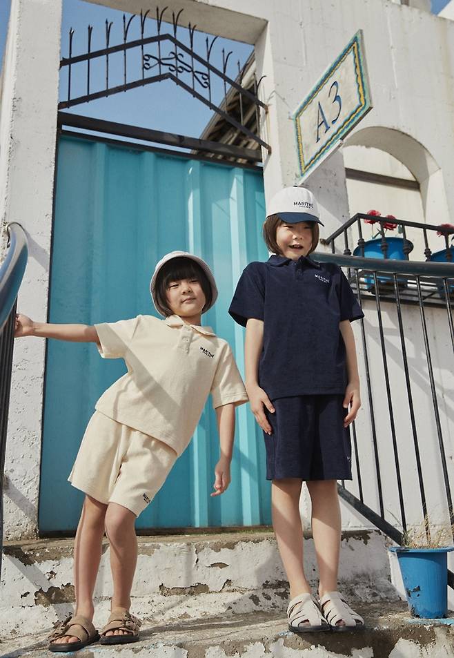 김나영과 신우와 이준은 그래픽 아트워크의 클래식한 자수 슬리브리스 티셔츠, 부드러운 테리 소재의 티셔츠와 팬츠 셋업, 메시 소재의 캠프 캡과 함께한 스타일링한 나일론 우븐 셋업 등을 입고 닮은꼴 스타일의 여름 휴양지 패밀리룩을 선보였다.