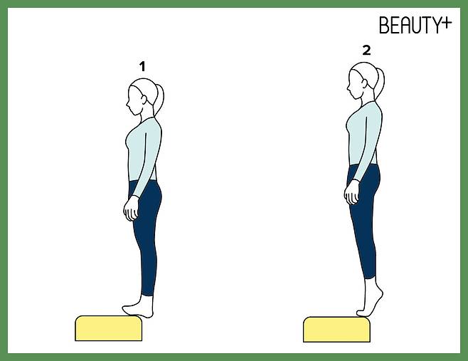 1 스텝 박스 위에 발끝만 올리고 바르게 선다. 발뒤꿈치를 가볍게 든 채 발끝에 힘을 싣는다.
