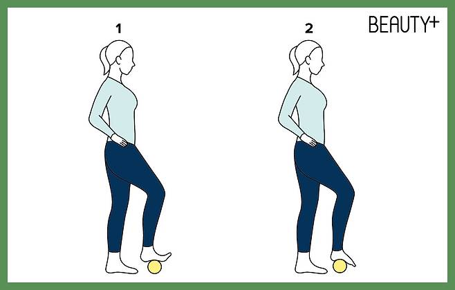 1 발바닥 아래에 마사지 볼을 대고 체중을 실어 가볍게 누른다.