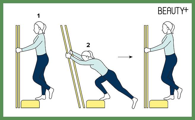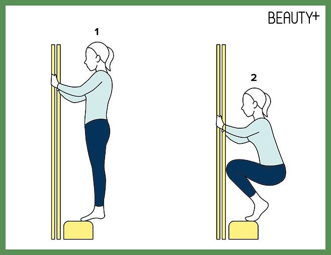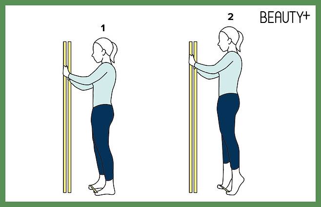 2 발뒤꿈치를 최대한 올렸다가 천천히 내린다. 몸이 앞으로 기울어지지 않게 주의하며 반복.