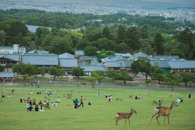 킨테츠 나라역에서 가장 가까운 나라 공원은 나라 여행의 시작점이라고 할 수 있습니다. 넓고 탁 트인 잔디밭 위로 수십 마리의 사슴들이 거닐며, 여행객들을 향해 조심스레 다가오는 모습은 만화 속이 아니라 현실입니다.