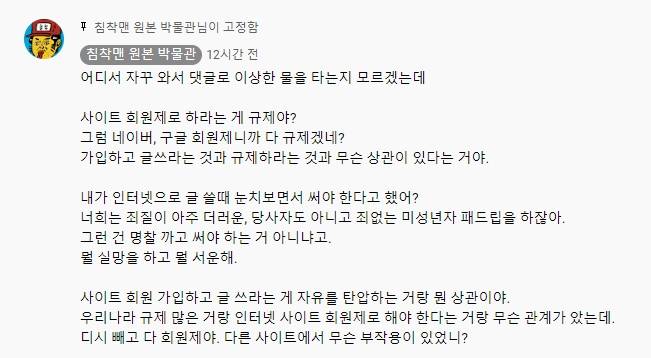 결국 침착맨은 "어디서 자꾸 와서 댓글로 이상한 물을 타는지 모르겠는데, 사이트 회원제로 하라는 게 규제냐. 그럼 네이버, 구글 회원제니까 다 규제겠다. 가입하고 글쓰라는 것과 규제하라는 것과 무슨 상관이 있다는 거냐"고 시작되는 장문의 고정 댓글을 남겼다.