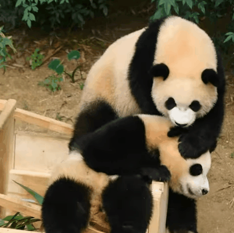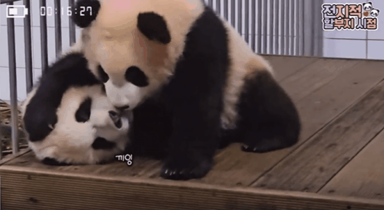 루이바오는 그렇게 동생을 껴안고, 눈을 가리기도 하고 깨물기도 합니다.