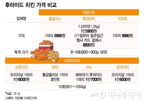이마트도 지난달 초부터 9호(851~950g) 냉장육을 사용한 '5분 치킨' 1마리를 9980원에 팔기 시작했다. 롯데마트도 가세해 이날부터 일주일간 9~11호(851~1150g) 계육으로 만든 '뉴 한통 가아아득 치킨' 약 1마리 반(1.2㎏)을 정가 1만5800원 대비 44% 할인된 8800원에 판매하기로 했다. 롯데마트가 초저가 치킨을 선보이는 것은 2010년 1마리에 5000원이었던 통큰치킨 이후 12년여 만이다.