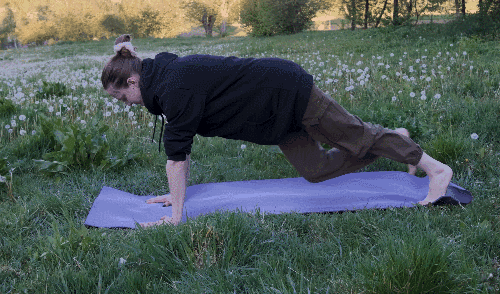 플랭크 기본자세로 엎드리세요. 왼쪽 무릎을 상체 쪽으로 당겨, 오른쪽 팔꿈치에 가까이 가져갑니다. 왼쪽 다리를 다시 제자리로 되돌립니다. 이어서 오른쪽 무릎을 당겨 왼쪽 팔꿈치에 가까이 가져갑니다.